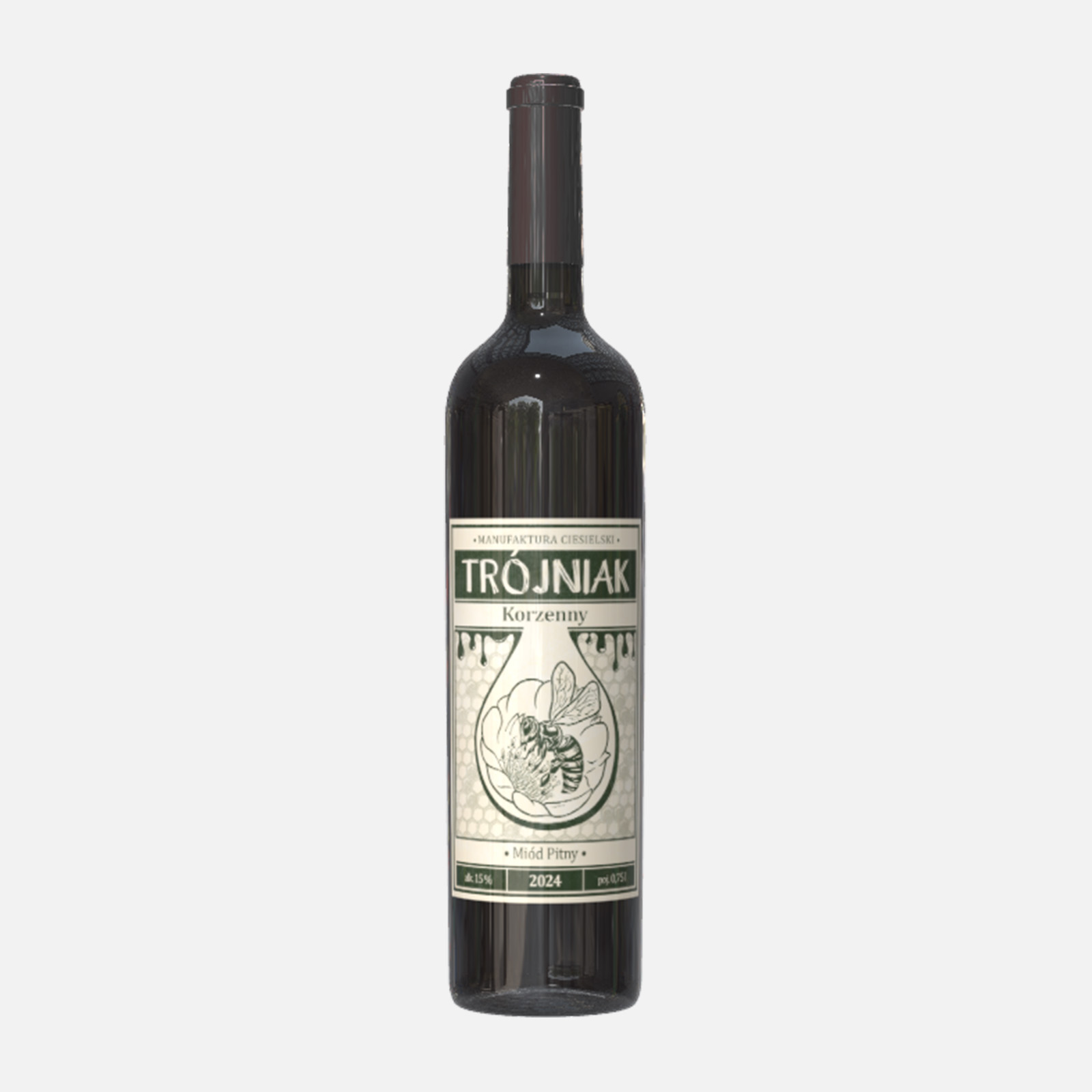 Miód pitny na bazie naturalnego miodu pszczelego (spadź iglasta 50%, rzepakowy 35%, gryczany 15%) z dodatkami przypraw: