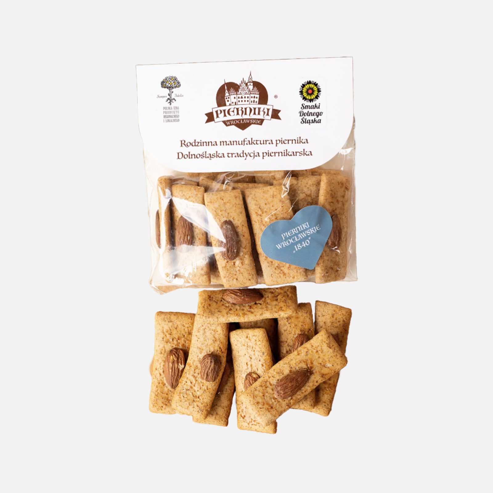 Przyjęło się współcześnie uważać, iż Dolny Śląsk był krainą pierników. Istotnie w większości miast i miasteczek od czasów średniowiecza mistrzowie w sztuce korzennych wypieków wyciągali z pieców ciasta z dodatkiem różnych wonnych przypraw. A piernikarze tworzyli własne cechy lub gildie, bądź też pracowali pod opieką starszyzny cechowej piekarzy. Zdarzały się jednak na mapie regionu – rzec można – piernikowe pustynie. Do jednej z nich należała Kamienna Góra. Trudno uwierzyć, ale u stóp Gór Kruczych aż do 1860 r. nikt nie zajmował się zawodowo wypiekiem pierników. Do miasta nie przybył też żaden cukiernik, by otworzyć zakład ze słodką ofertą. Przełom nastąpił wraz z rozwojem przemysłu, a zwłaszcza branży włókienniczej i tekstylnej w drugiej połowie XIX w. Wówczas to wyrosła marka konditora Wilhelma Finke, który przed świętami Bożego Narodzenia oferował m.in. pierniczki wałbrzyskie, cieplickiego safandułę (Warmbrunner Talsack), nyskie konfekty, bazylejskie i norymberskie klasyki, a jego koledzy po fachu bomby piernikowe. Lecz naszą uwagę w tym wcześniejszym deficycie korzennych aromatów zwróciła wydana w Kamiennej Górze książka kucharska Wohlfeiles und praktisches Schlesisches Kochbuch, edytowana w 1840 r. w oficynie braci Lips. Odnajdujemy w niej pewną odmianę jednego z pierników aacheńskich (Aachener Printren) z migdałem wetkniętym na wierzchu. Urzekł nas bardzo ów niuans historyczno-kulturowy, że zanim pierniki „przyszły” do kamiennogórzan, mogli sami wypiekać je w było nie było renomowanej manierze. Numerologia jest nam zupełnie obca, a do nazwy pierniczków zainspirowała nas data wydania książki.